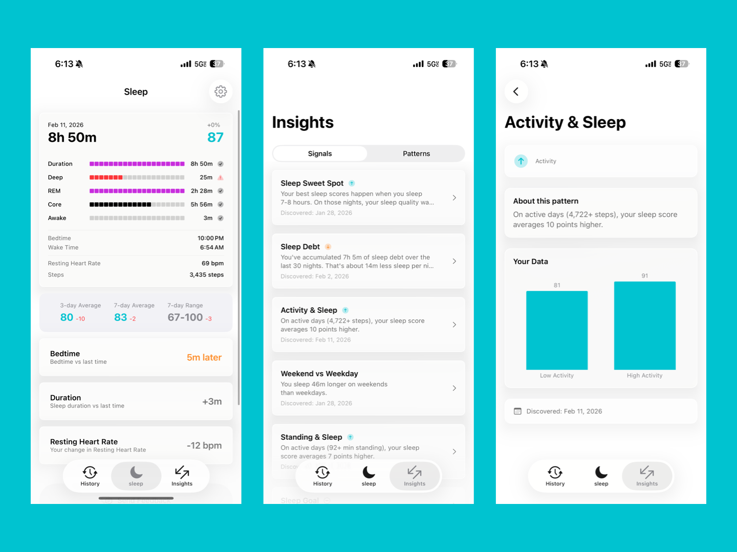Sleep insights with real context. Your sleep score plus the health metrics that happened that day steps, exercise time, resting heart rate all in one view.